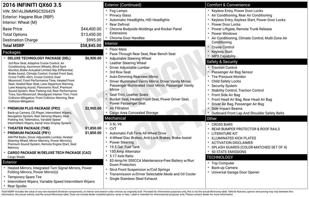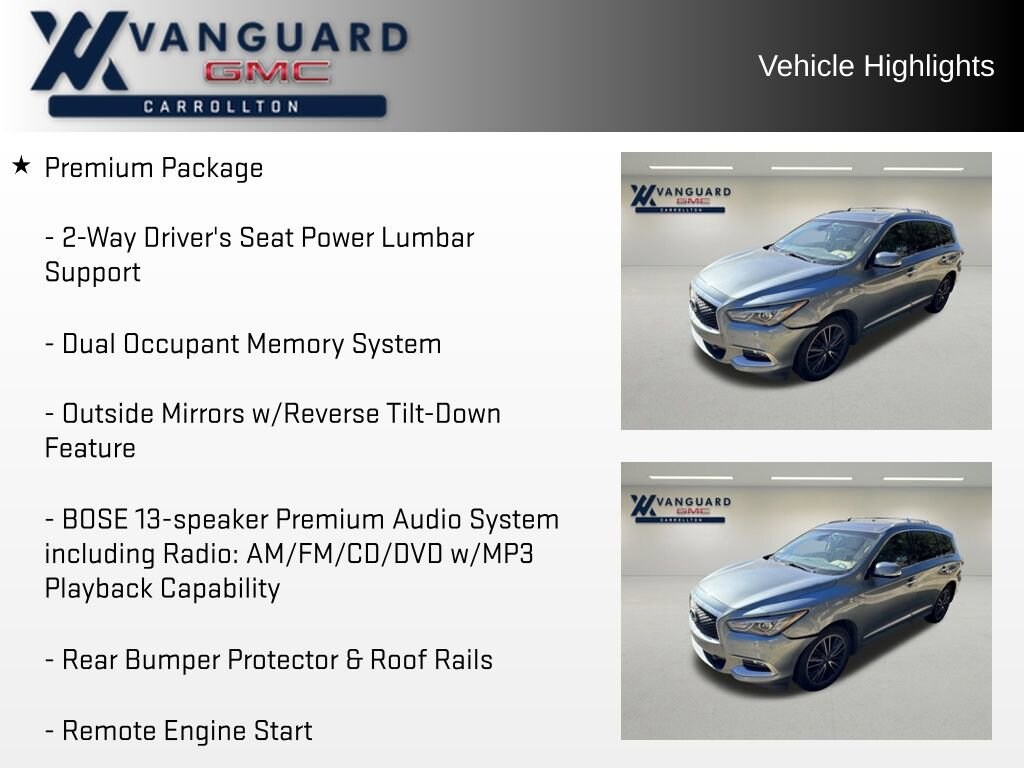 Discover the exceptional 2016 INFINITI QX60 Base, a sophisticated and versatile SUV that seamlessly blends style, performance, and cutting-edge technology. With its sleek exterior, spacious interior, and a host of premium features, this QX60 is poised to elevate your driving experience.Highlighted features include: DELUXE TECHNOLOGY PACKAGE PREMIUM PLUS PACKAGE THEATER PACKAGE PREMIUM PACKAGE BOSE 13-speaker Premium Audio System INFINITI Voice Recognition Wireless Headphones Remote Engine Start Heated Steering Wheel Dual 7 Color Monitors Around View Monitor with Sonar System INFINITI Navigation System with XM NavTraffic and NavWeatherThis QX60 Base is powered by a robust 3.5L V6 engine paired with a sport-tuned CVT transmission and all-wheel drive, delivering a dynamic and responsive driving experience. With an impressive EPA-estimated 19 MPG city and 26 MPG highway, this SUV strikes the perfect balance between power and efficiency.Slip into the luxurious leather-appointed seats and experience the unparalleled comfort and convenience of features like dual-zone automatic climate control, heated front seats, and a power liftgate. The spacious cabin offers seating for up to seven passengers, ensuring ample room for your family and friends.Elevate your daily commute or weekend adventures with the QX60's cutting-edge technology. The INFINITI Navigation System with XM NavTraffic and NavWeather keeps you connected and informed, while the Around View Monitor with Sonar System provides a 360-degree view for effortless parking and maneuvering.Indulge in the rich, immersive sound of the BOSE 13-speaker premium audio system, complete with a single in-dash CD player and Bluetooth wireless technology for seamless streaming. The Theater Package adds dual 7-inch color monitors and wireless headphones, transforming the QX60 into a mobile entertainment hub.With its impressive list of features, exceptional performance, and sophisticated design, the 2016 INFINITI QX60 Base is a remarkable SUV that is sure to exceed your expectations. Experience the difference for yourself by scheduling a test drive at our showroom today.